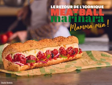 L’iconique Meatball Marinara est de retour chez Subway ! 🤌 Une recette de légende revient en cette rentrée 2025. Le Subway Meatball Marinara est disponible en édition limitée du 3 septembre au 25 novembre 2025 dans les restaurants Subway participants. 👉 Pourquoi tout le monde l’adore ? Des boulettes de bœuf savoureuses (Meatballs) Notre sauce marinara italienne parfumée 🍅 Du fromage américain fondant 🧀 Des légumes frais : oignons rouges, poivrons verts, olives noires Et des topping gourmands : parmesan et crispy onions ✨ 🔥 Disponible en SUB (sandwich) ou en BOWL (bol). 📍 Retrouvez le Meatball Marinara dans votre restaurant Subway à [Ville] : un repas chaud, généreux et réconfortant pour vos pauses déjeuner ou vos soirées automnales. 📅 Attention : seulement du 03/09 au 25/11/2025, ne ratez pas ce retour très attendu ! ⚖️ Pour votre santé, mangez au moins cinq fruits et légumes par jour.